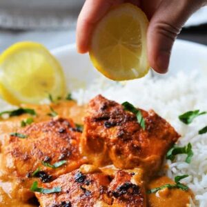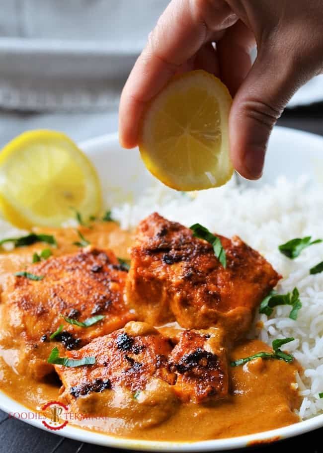 Un plat populaire compose de morceaux de poisson marines cuits dans une sauce cremeuse epicee parfumee aux tomates .
