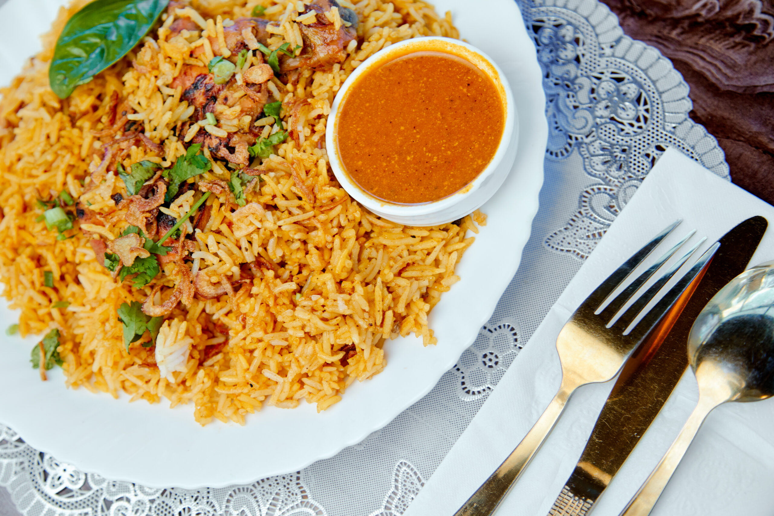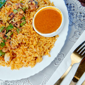 « Le Kabsa au poulet est l’un des plats les plus célèbres de la cuisine arabe, réputé pour sa saveur riche et l’équilibre parfait entre son riz parfumé aux épices et son poulet tendre. Ce plat est préparé avec des épices spéciales comme la cardamome, le clou de girofle et le citron séché (loomi), qui lui donnent un arôme enivrant et un goût irrésistible. »