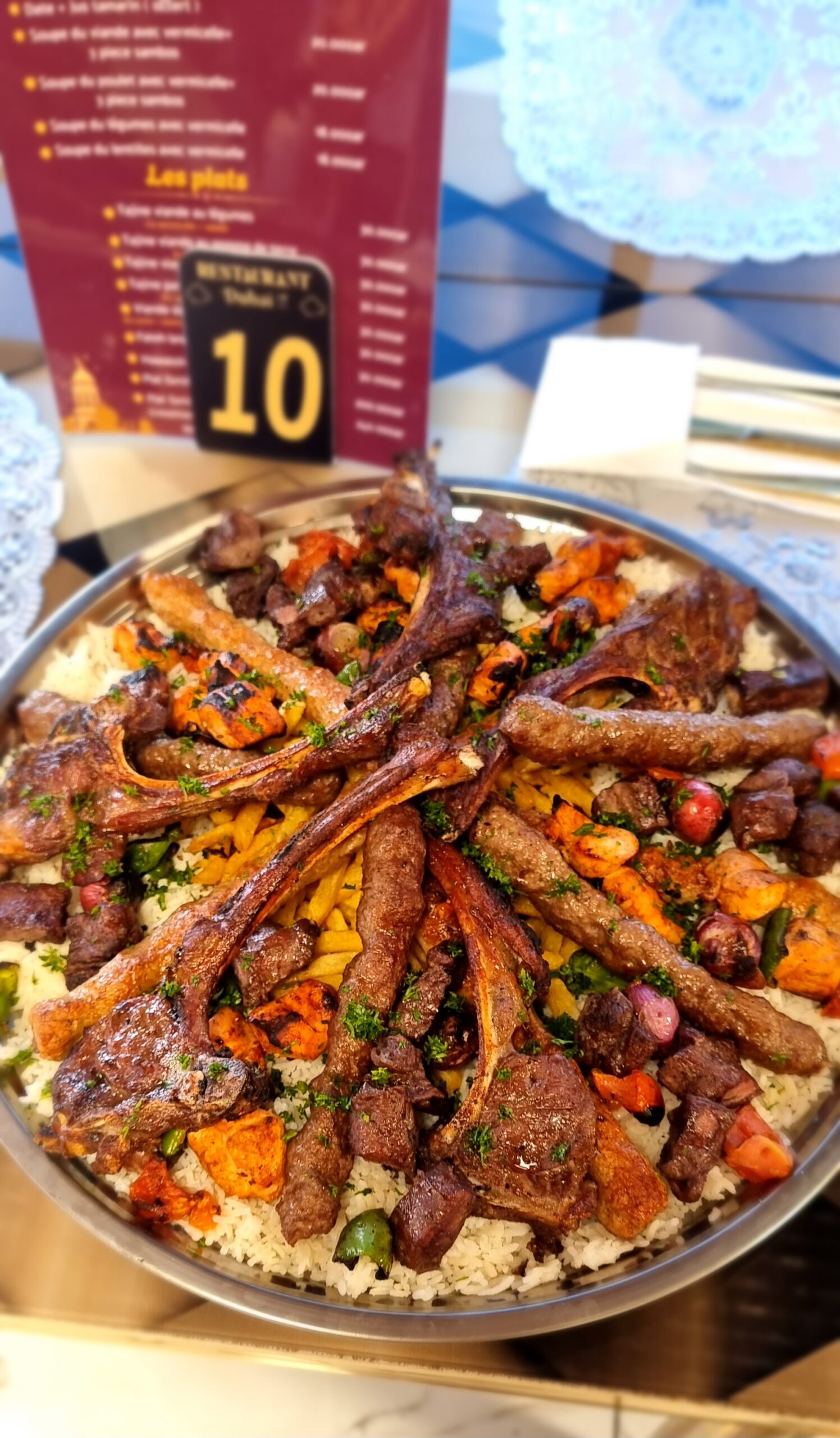 Grand assortiment de grillades pour cinq personnes, accompagné de kebab viande et poulet , brochette viande , shish tawook , cote de mouton.