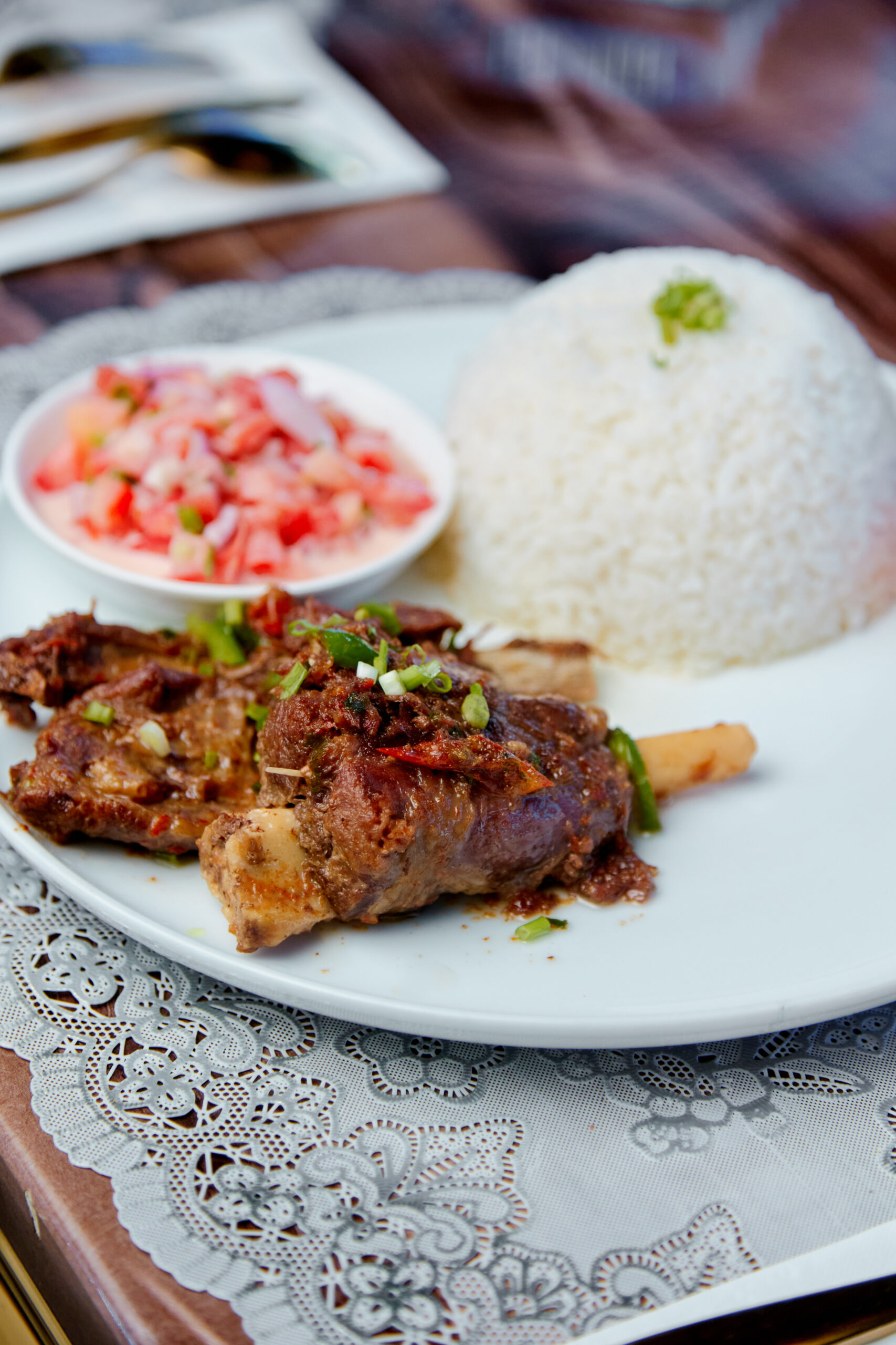 Mouton ritra Leave a Comment / By Admin / mai 28, 2025 Agneau lentement cuit avec une sauce maison et une salade fraîche. Price: 23,000 Ar Vous aimerez peut-être aussi Poulet Ritra Poulet au Coco Mouton sauce