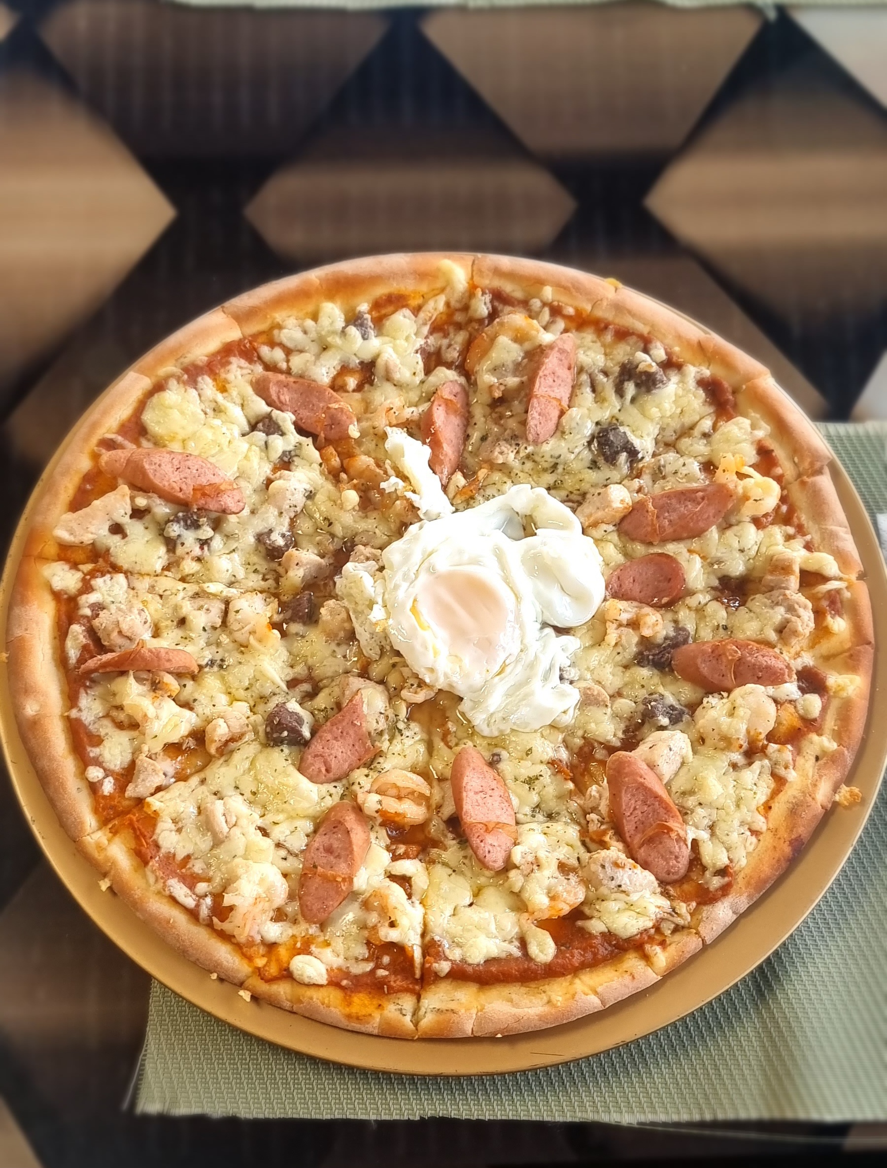 Pizza généreuse aux fruits de mer, viandes, poulet, saucisses et œufs — une explosion de saveurs de Dubaï.