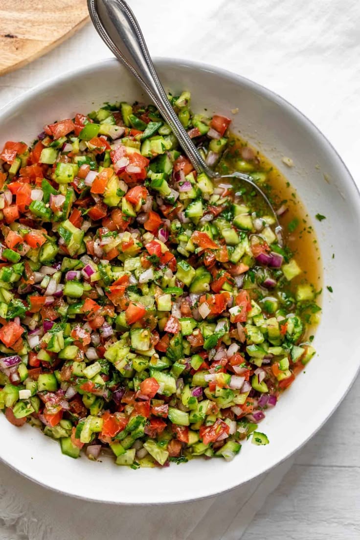 A fresh and vibrant salad made with diced tomatoes, cucumbers, onions, green peppers, parsley, and mint, tossed with olive oil and lemon juice. A healthy and refreshing starter popular across the Middle East.