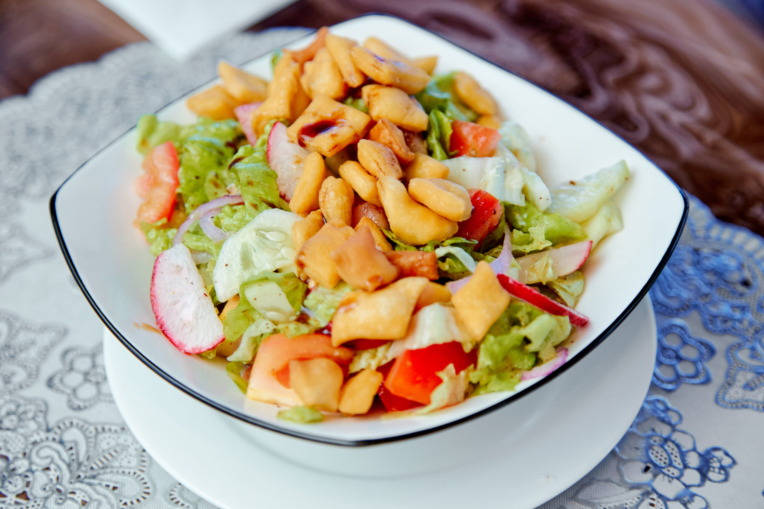 A traditional Levantine salad made with mixed fresh greens, crunchy toasted pita bread, tomatoes, cucumbers, radishes, and fresh herbs, all tossed in a tangy sumac and lemon dressing. A perfect refreshing starter.