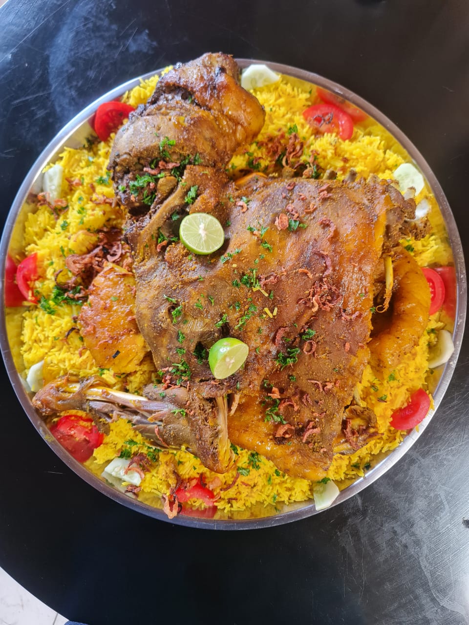 A flavorful quarter portion of roasted lamb with a crispy outer layer and tender meat inside. Served alongside spiced basmati rice with nuts and fresh herbs, perfect for a satisfying yet lighter meal.