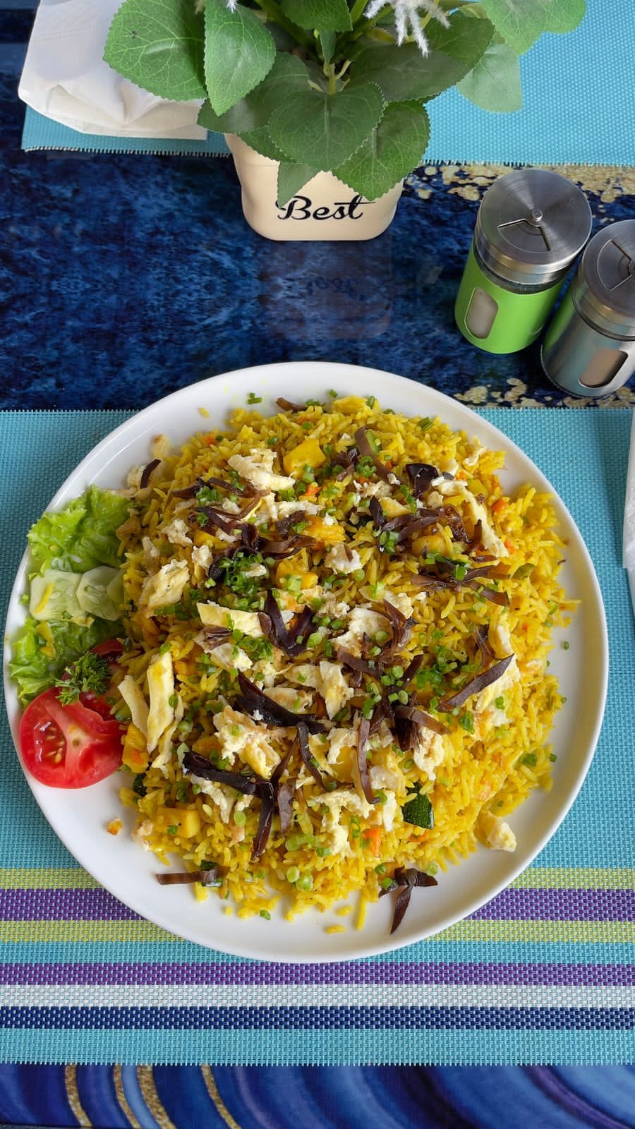 Fragrant stir-fried rice cooked with tender chicken, fresh vegetables, and scrambled eggs, delivering a classic and satisfying Cantonese flavor.