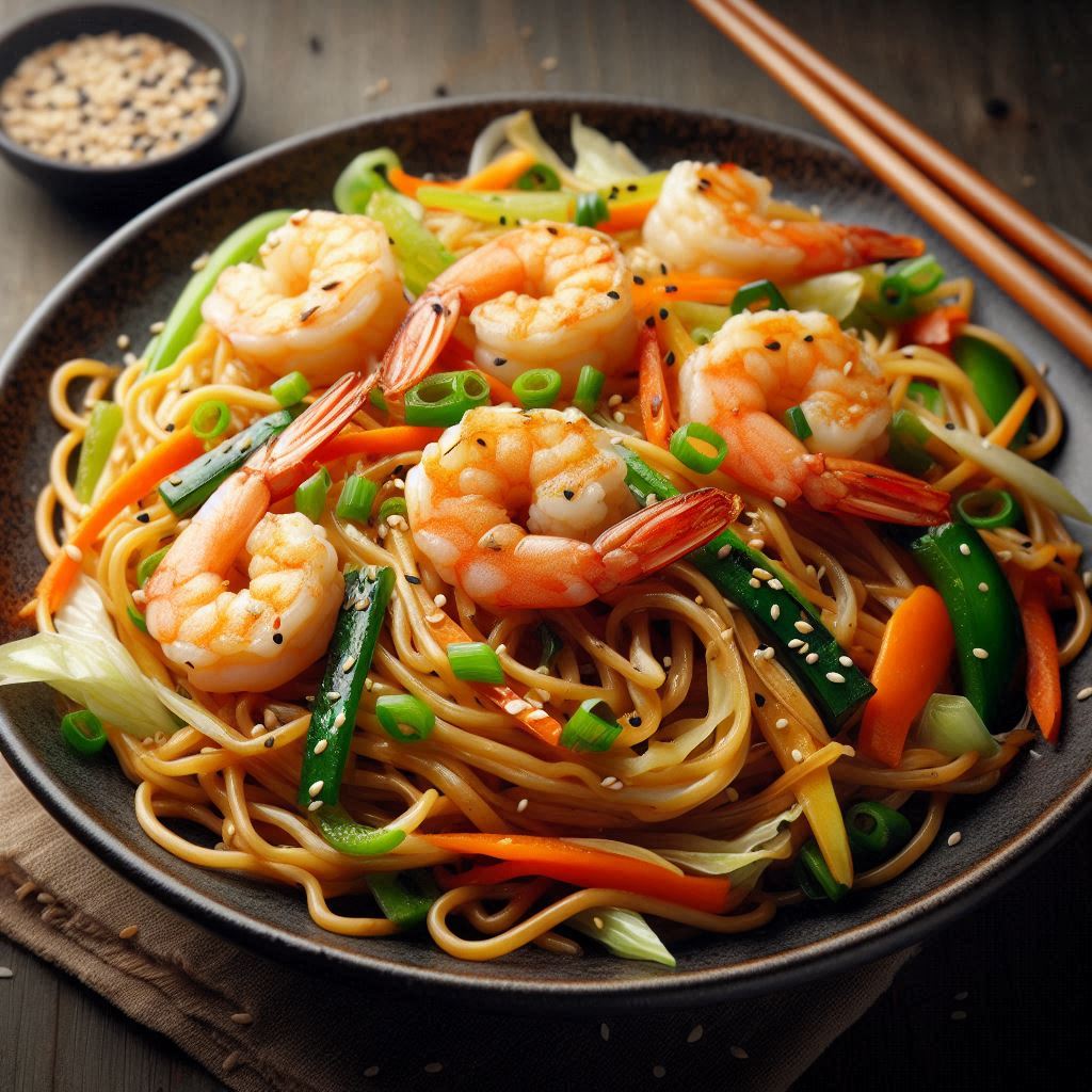 Delicious stir-fried noodles tossed with succulent shrimp and a colorful mix of fresh vegetables, seasoned with soy sauce and spices. A flavorful and satisfying Asian-inspired dish.